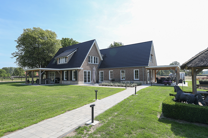- Materialen: Het buitenblad staat op de karakteristieke Bentheimer zandsteen, daarop is een genuanceerde gevelsteen gemetseld in wildverband. De verdiepingsvloer bestaat uit een breedplaatvloer waarin alle leidingen t.b.v. de diverse installaties zijn weg gewerkt. Door de keramische dakpannen, onderhoudsvrije luiken, eiken topgevels en overkappingen word het een kwalitatief hoogstaande woning.